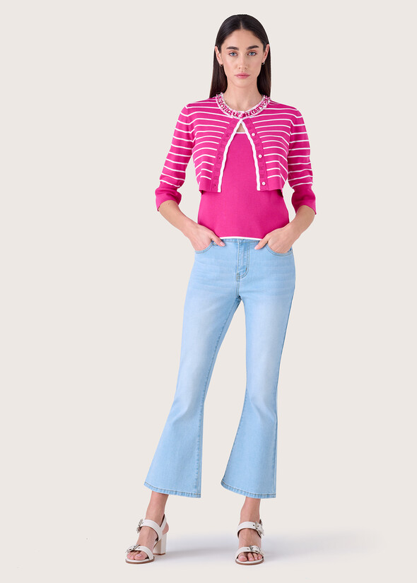 The Cindy denim model stands out with its flared leg, designed to elongate the silhouette, ...